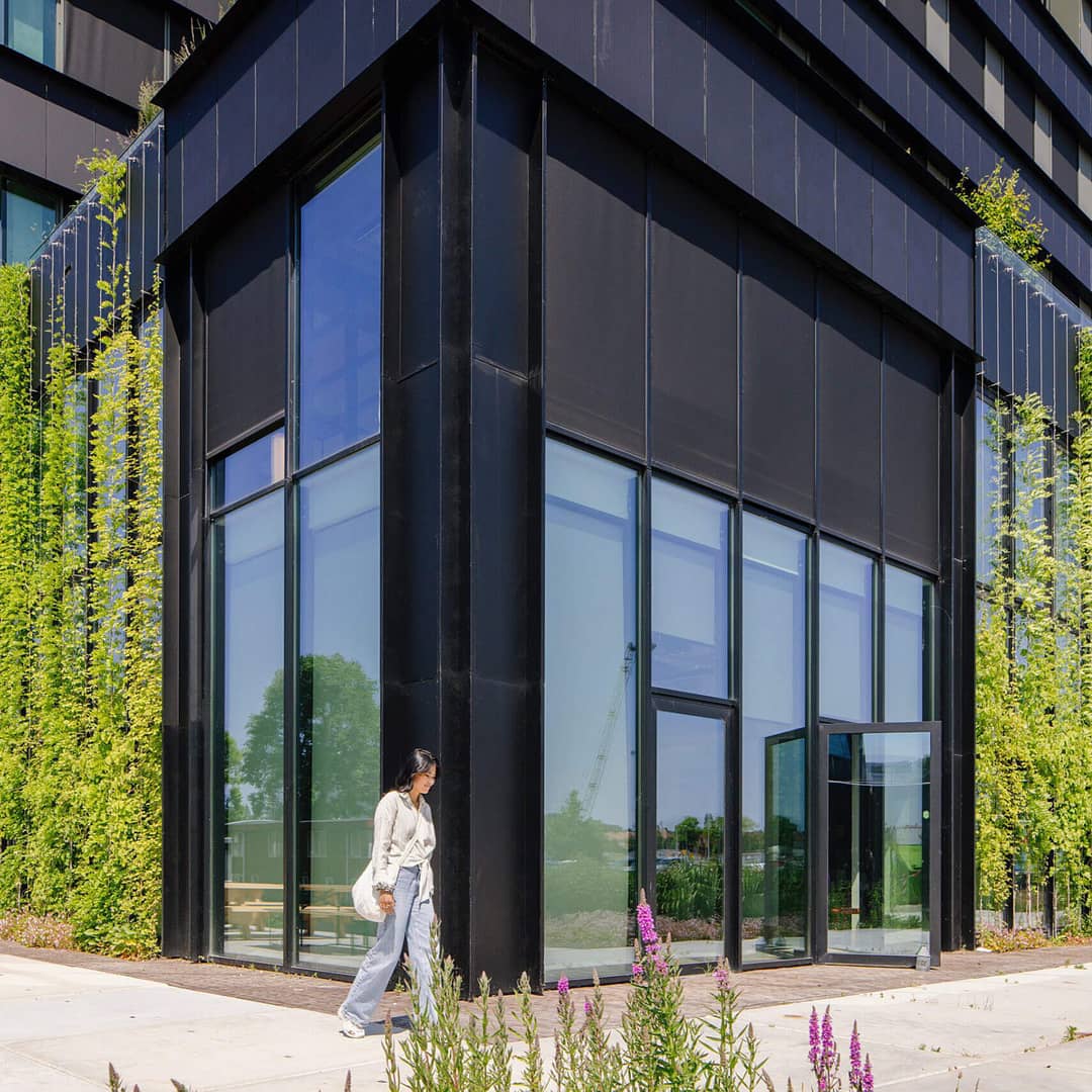het bouwprogramma horecaruimtes, 88 parkeerplaatsen en een overdekte fietsenstalling. De gevel is volledig belegd met zonnepanelen dus zowel in wit als zwarte uitvoering. Het ecologische terrein heeft een diversiteit aan begroeiing in en rond de wadi’s.