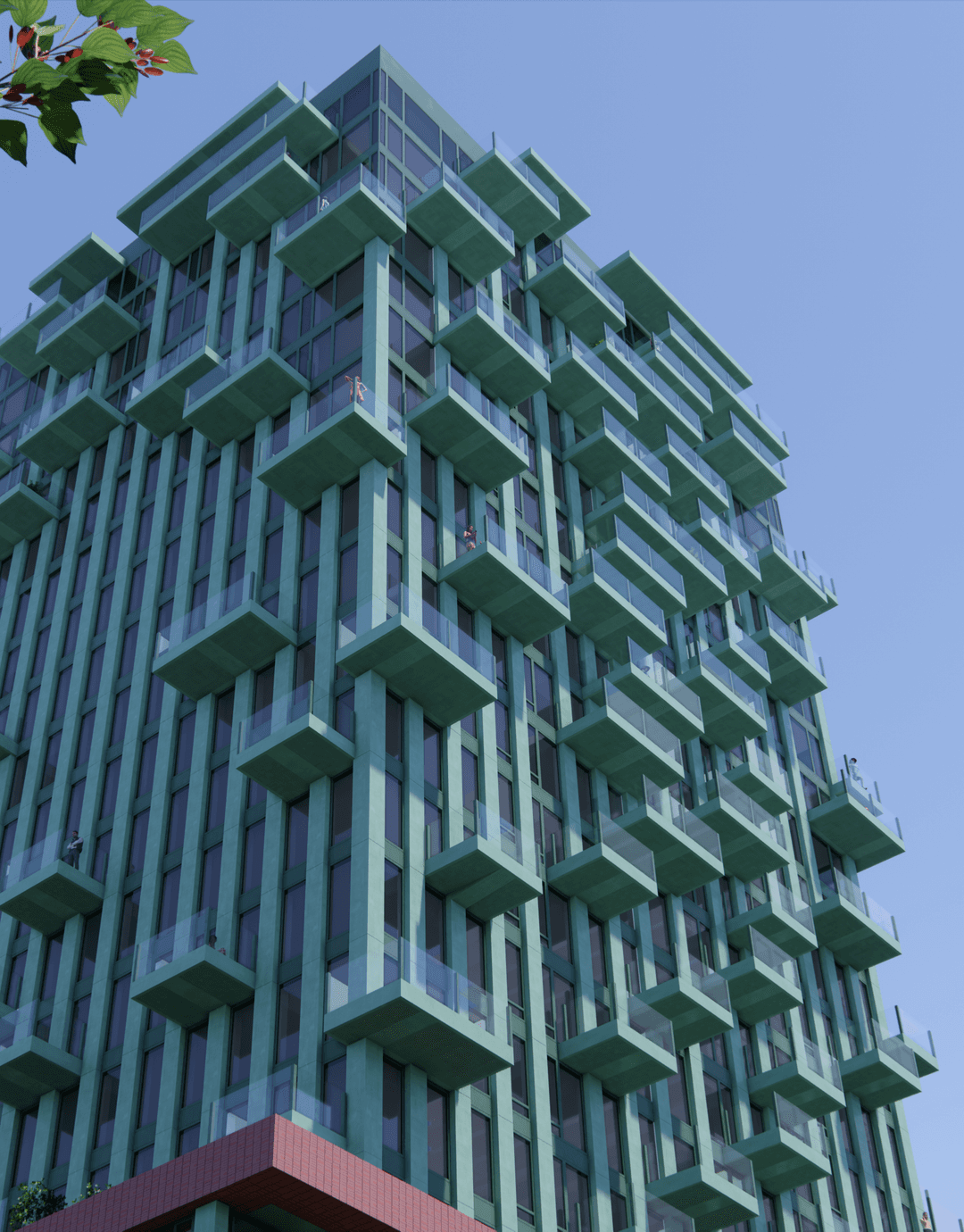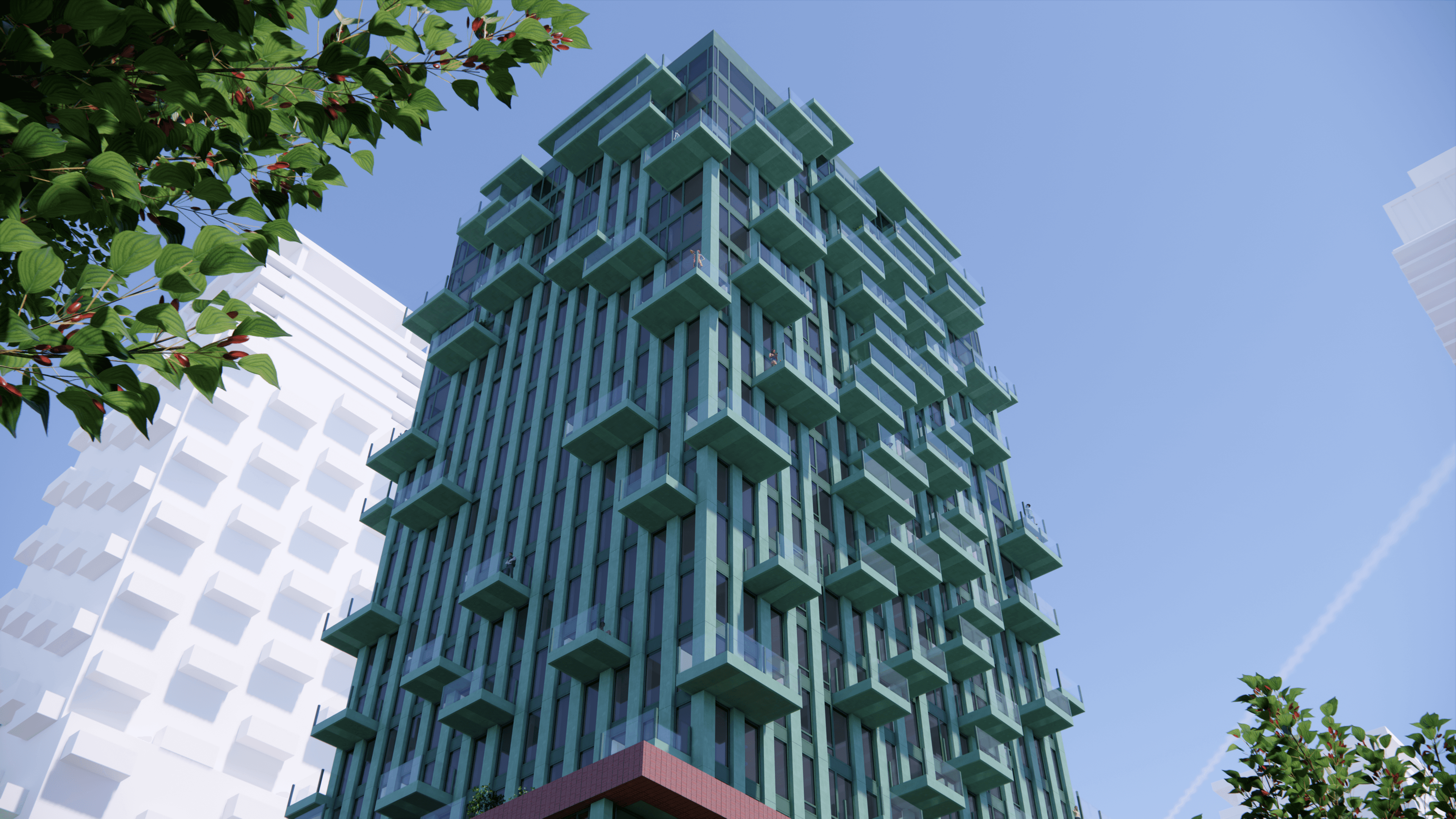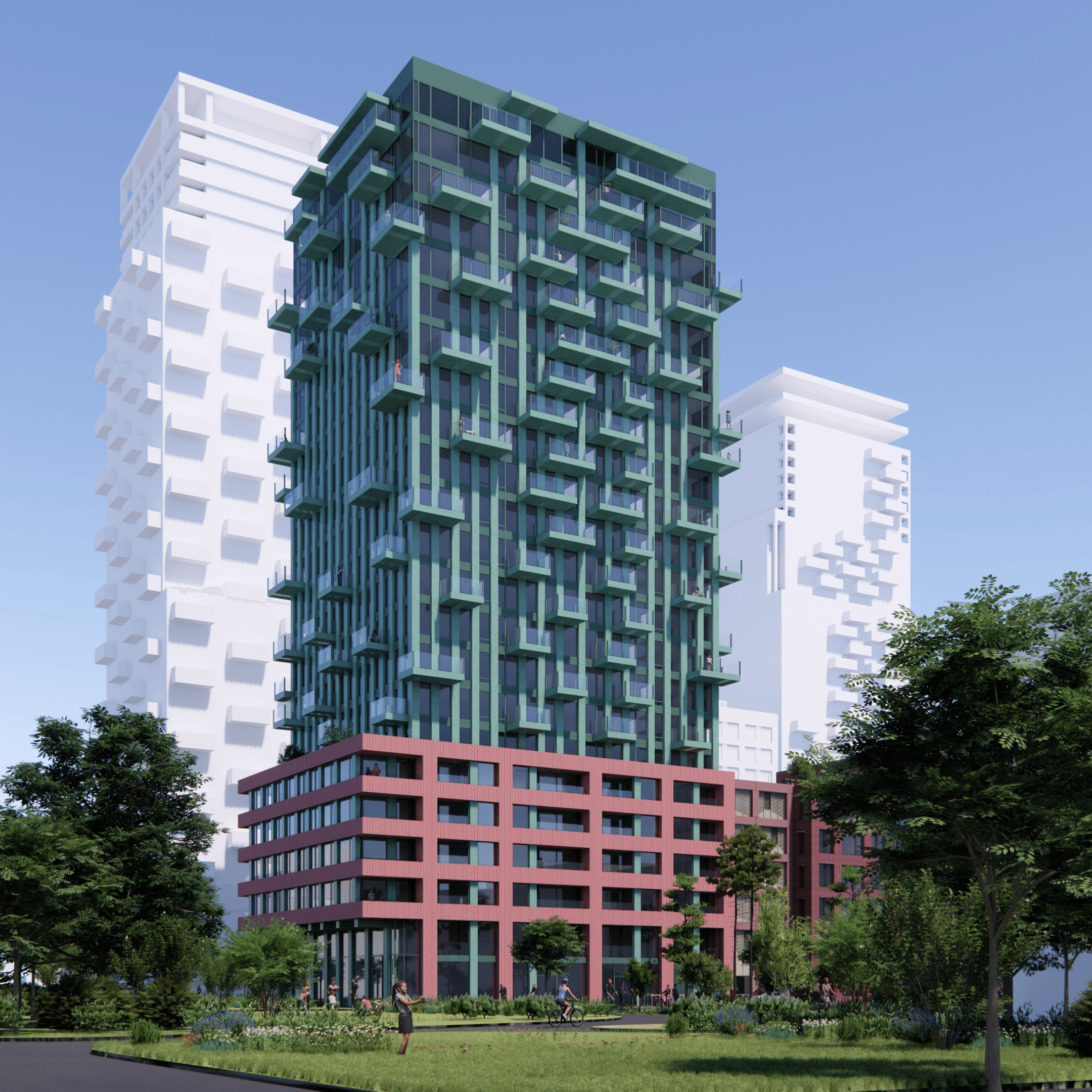 Het woongebouw heeft een omvang van circa 25.000 m² BVO en is opgebouwd uit volumes van 70, 25 en 19 meter hoog, waarmee het aansluit op de schaal en dynamiek van de omgeving. In totaal worden 263 appartementen gerealiseerd, variërend van sociale huur (71 woningen) en middensegment (108 woningen) tot vrije sector (84 woningen), waaronder vier penthouses. Alle woningen beschikken over een eigen buitenruimte en zijn ontworpen met aandacht voor licht, comfort en gebruikskwaliteit. In de plint komt circa 800 m² beschikbaar voor commerciële en maatschappelijke voorzieningen, die bijdragen aan de levendigheid van de buurt.